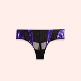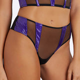 La culotte perizoma Mystique gioca su trasparenze e vedo-non vedo, arricchiti dai tasselli viola in vinile, che aggiungono quel tocco moderno di seduzione ed erotismo. Abbinala al corpetto per un completino Privé super hot.