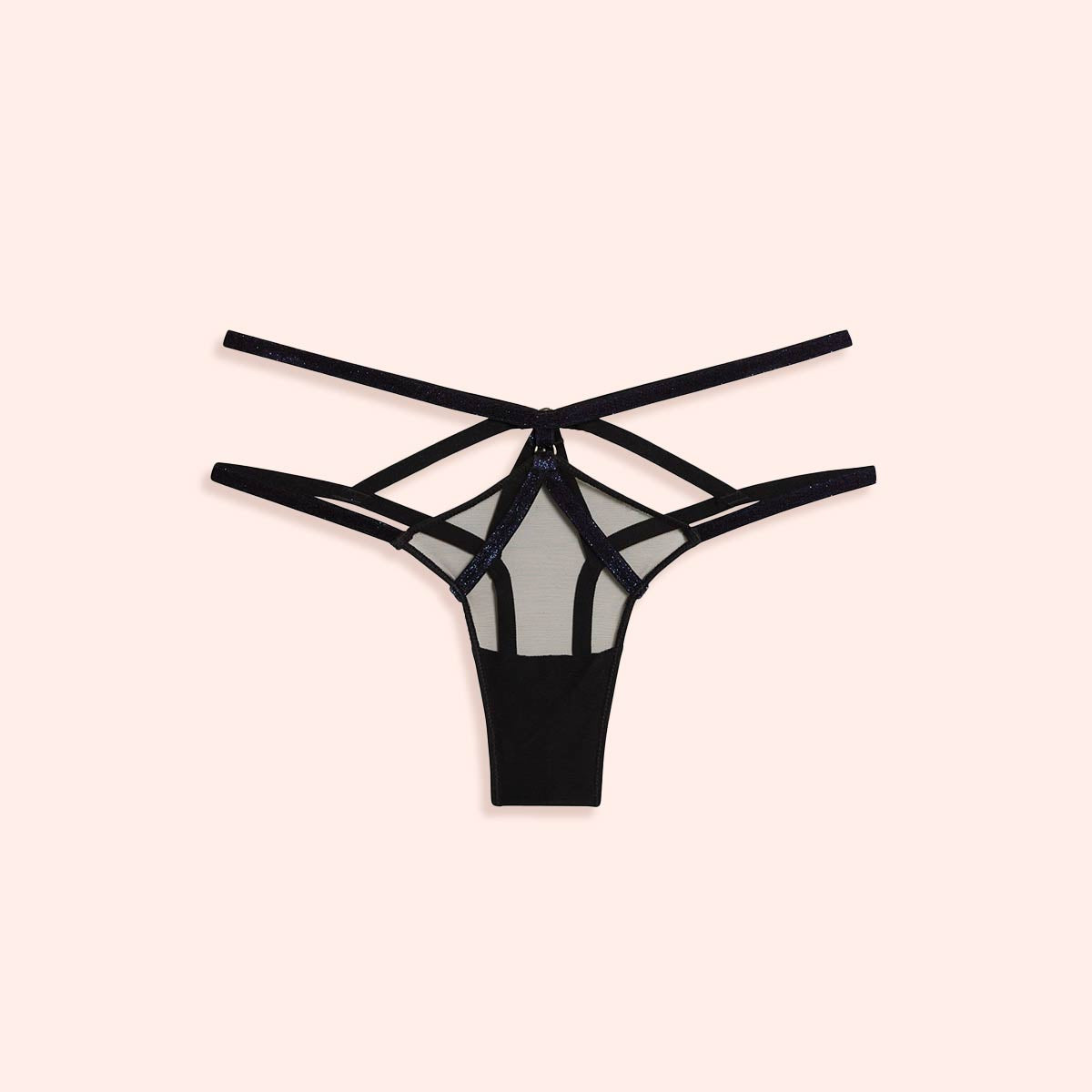 Tulle trasparente, elementi cut-out e aperture suadenti, per un effetto wow, hot e irresistibile. Glitter blu arricchisce la struttura dei capi. Scegli la brasiliana, completamente aperta sul retro e con un piccolo pannello davanti, abbinala al reggiseno carioca e preparati per momenti di focosa intimità.