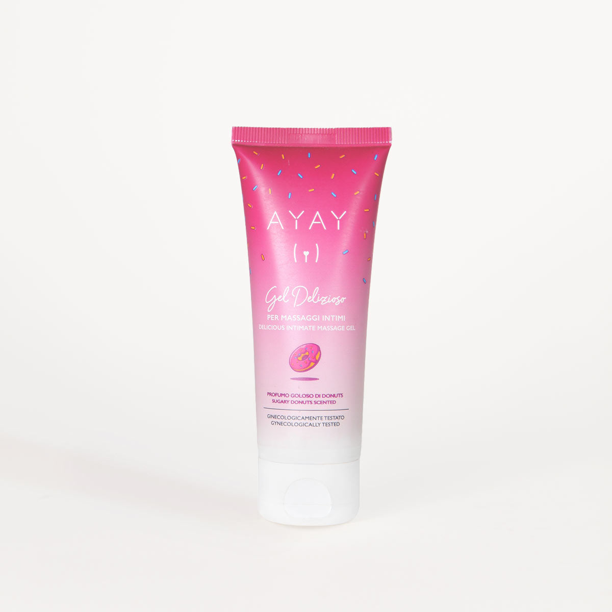 Je suis le premier gel de massage total body pour des massages érotiques sensuels d'AYAY : totalement sûr, Made in Italy, avec un parfum sucré et irrésistible inspiré des donuts, conçu pour augmenter le plaisir féminin et masculin. Je ne laisse pas de film gras, je ne tâche pas et je suis testé gynécologiquement. Parfait pour des massages sensuels sur tout le corps grâce à ma texture hydratante, ma composition propre et naturelle à base d'eau. Si jamais tu me frôles avec tes lèvres ou si tu m'ingères en petites quantités, ce n'est pas un problème 😏 Mon parfum délicieux stimule les sens et réveille les appétits les plus irrésistibles, t'emmenant à un nouveau niveau de plaisir avec ma texture riche et hydratante.