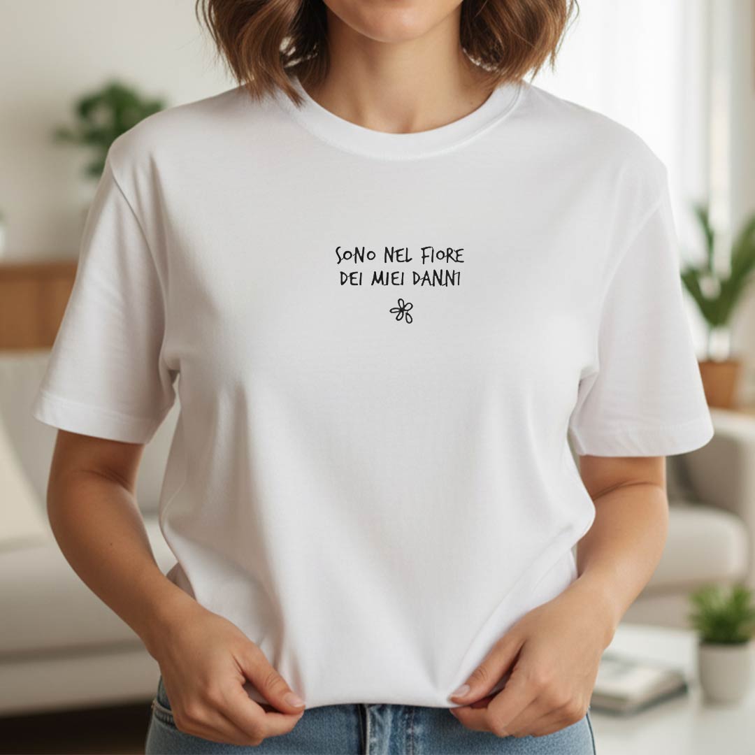 T-shirt con ricamo "Sono nel fiore dei miei danni"