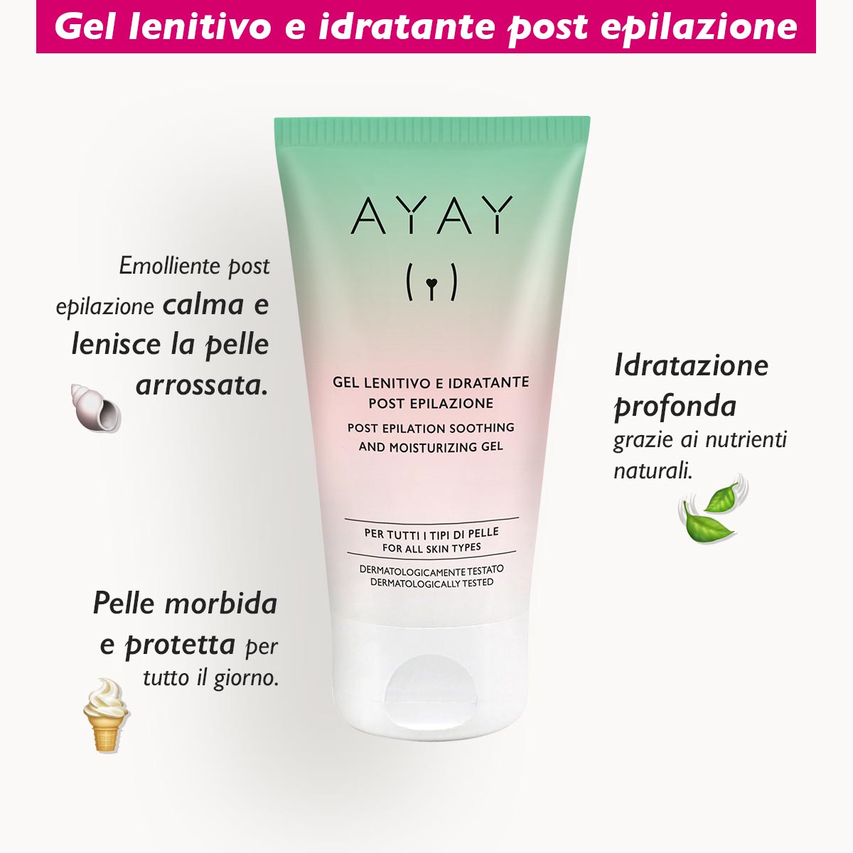 Sono una crema lenitiva e nutriente per la pelle, perfetta per il post epilazione e per combattere il prurito. Ideale per prevenire peli incarniti, follicoliti e irritazioni da strappo o da tessuto, mi prendo cura della tua pelle nei momenti più critici come il dopo ceretta. Grazie ai miei super ingredienti, rigenero, lenisco e ammorbidisco la tua pelle. Amerai la mia profumazione fresca e delicata, e non vedrai l’ora di usarmi ogni mattina nella tua beauty routine!